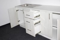 Mânerele metalice adaugă un aspect modern, iar picioarele reglabile fac bucătăria să fie perfect adaptată nevoilor tale. Sertarele culisante cu bile asigură o utilizare facilă, iar blatul termorezistent completează designul practic și elegant al întregului set de mobilă de bucătărie (180 cm).
