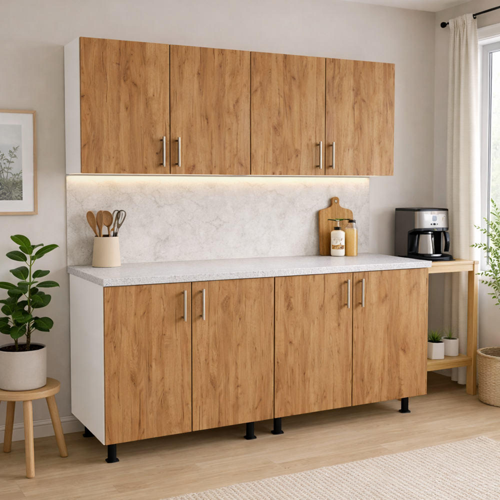 Acest set de bucătărie de 160 cm, realizat din PAL melaminat Kronospan Stejar Auriu Craft K003 PW, aduce un plus de căldură și natură în orice bucătărie modernă. Blatul Alb Mersin oferă un contrast luminos și curat, iar setul este compact, estetic și practic, proiectat pentru organizare superioară și durabilitate.