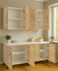 Acest set de bucătărie de 140 cm, realizat din PAL melaminat Kronospan Stejar Auriu Craft K003 PW, aduce un plus de căldură și natură în orice bucătărie modernă. Blatul Alb Mersin oferă un contrast luminos și curat, iar setul este compact, estetic și practic, proiectat pentru organizare superioară și durabilitate.