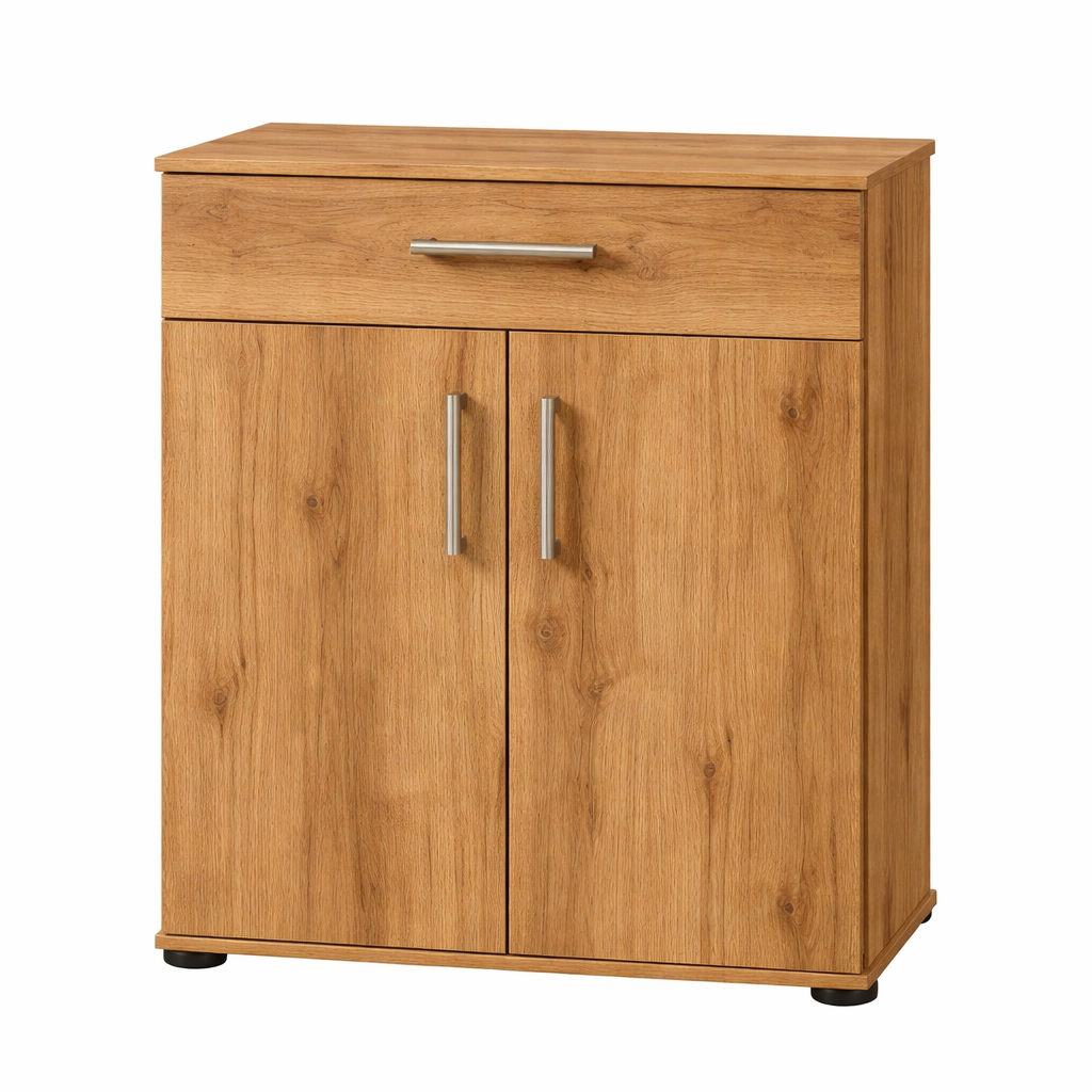 Comoda modernă 80 cm cu sertar și 2 uși PAL stejar auriu este o soluție practică și elegantă pentru organizarea eficientă a spațiului din locuința ta. Datorită dimensiunilor compacte și compartimentării inteligente, această comodă este ideală pentru dormitor, living, hol sau birou, oferind spațiu optim pentru depozitarea obiectelor esențiale.