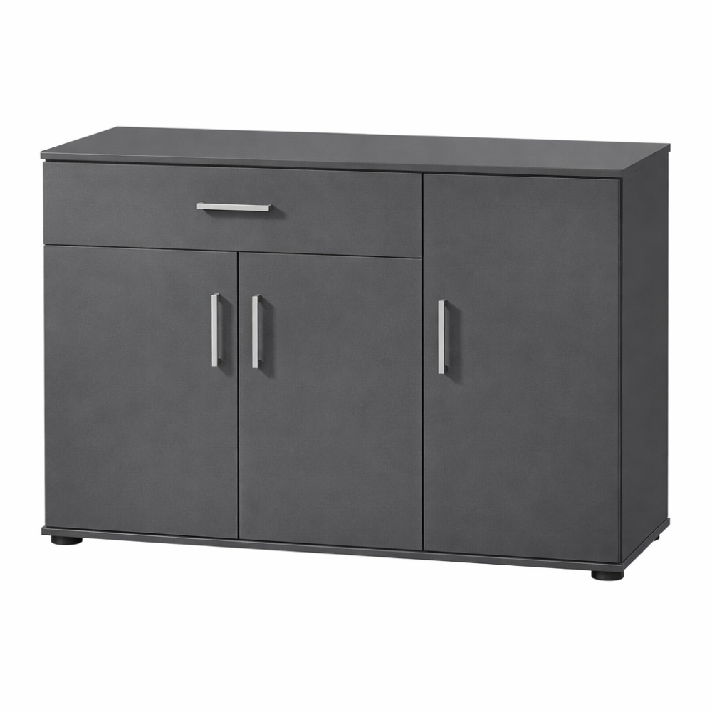 Comoda modernă 90 cm cu 3 uși și sertar PAL antracit este o alegere practică și compactă pentru organizarea eficientă a spațiului din locuința ta. Datorită designului funcțional și dimensiunilor echilibrate, această comodă este potrivită pentru dormitor, living, hol sau birou, oferind spațiu optim pentru depozitare zilnică.