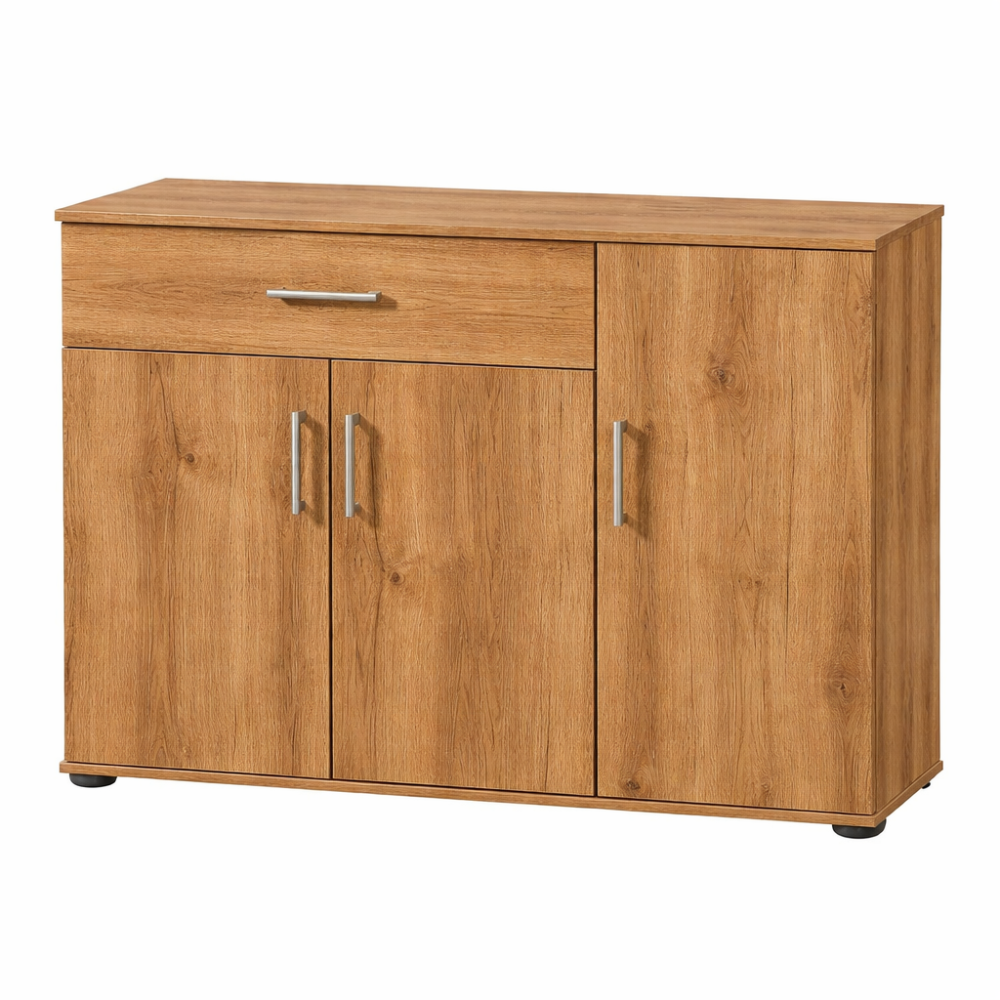 Comoda modernă 90 cm cu 3 uși și sertar PAL stejar auriu este o alegere practică și compactă pentru organizarea eficientă a spațiului din locuința ta. Datorită designului funcțional și dimensiunilor echilibrate, această comodă este potrivită pentru dormitor, living, hol sau birou, oferind spațiu optim pentru depozitare zilnică.