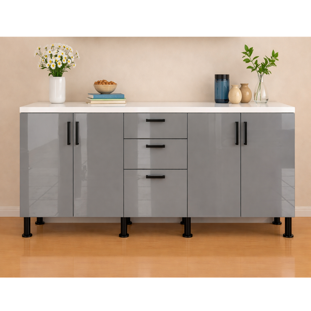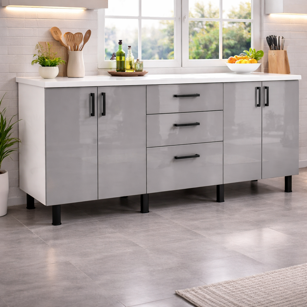 Corp baza bucatarie 200 cm MDF lucios gri este soluția ideală pentru cei care doresc să îmbine funcționalitatea cu un design modern și elegant. Acest corp inferior de bucătărie ieftină oferă soluții eficiente de organizare și este realizat din materiale de calitate, toate la un preț accesibil.