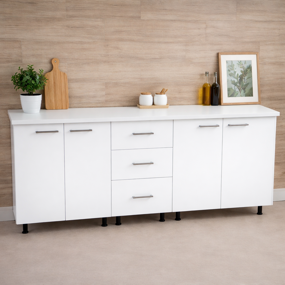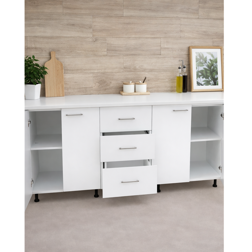 Corp baza bucatarie 200 cm PAL alb este soluția ideală pentru cei care doresc să îmbine funcționalitatea cu un design modern și elegant. Acest corp inferior de bucătărie ieftină oferă soluții eficiente de organizare și este realizat din materiale de calitate, toate la un preț accesibil.