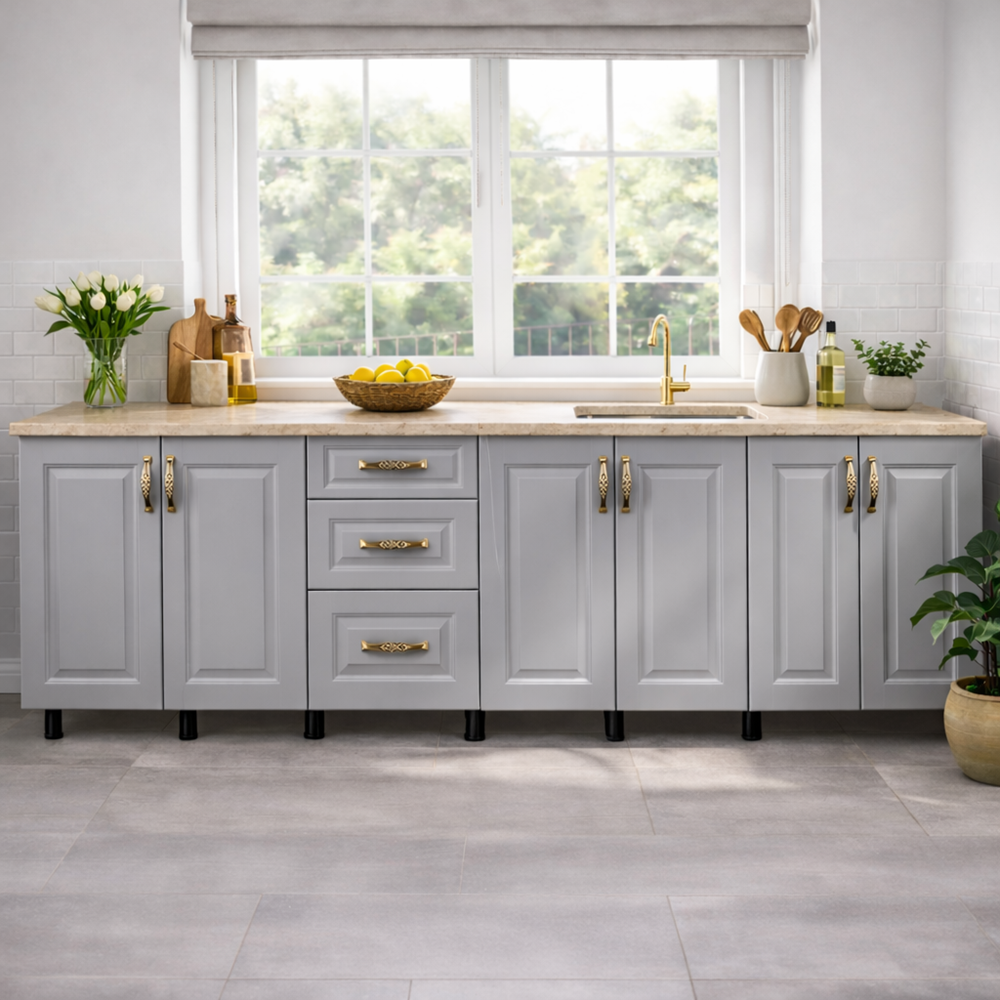 În orice bucătărie modernă, spațiul de depozitare este esențial. Corp baza bucatarie 260 cm mdf gri oferă soluții eficiente pentru organizare. Ideal pentru un spațiu de gătit bine organizat și estetic plăcut.
