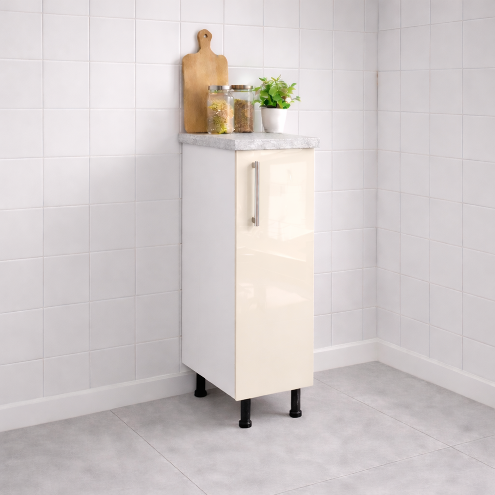 Acest corp bucatarie 20 cm MDF lucios crem , cu blat este soluția perfectă pentru zonele înguste ale bucătăriei, unde ai nevoie de un spațiu suplimentar de depozitare fără a compromite designul. Realizat din PAL melaminat de înaltă calitate, în nuanța elegantă MDF lucios crem , aduce un plus de stil și funcționalitate oricărei bucătării moderne.