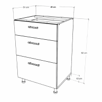 Construit pentru a fi eficient, corpul de bucatarie are un design simplu, potrivit sa se incadreze in orice stil. Acest model de corp de baza are carcasa de culoare alba, iar fronturile sertarelor vin in culoarea IVOIRE. Fabricat din PAL melaminat de 18 mm, corpul de baza cu 3 sertare vine fara blat, la fel ca toate celelalte corpuri inferioare modulare pentru bucatarie. Verifica si restul corpurilor de mobilier pentru bucatarie din aceasta colectie.