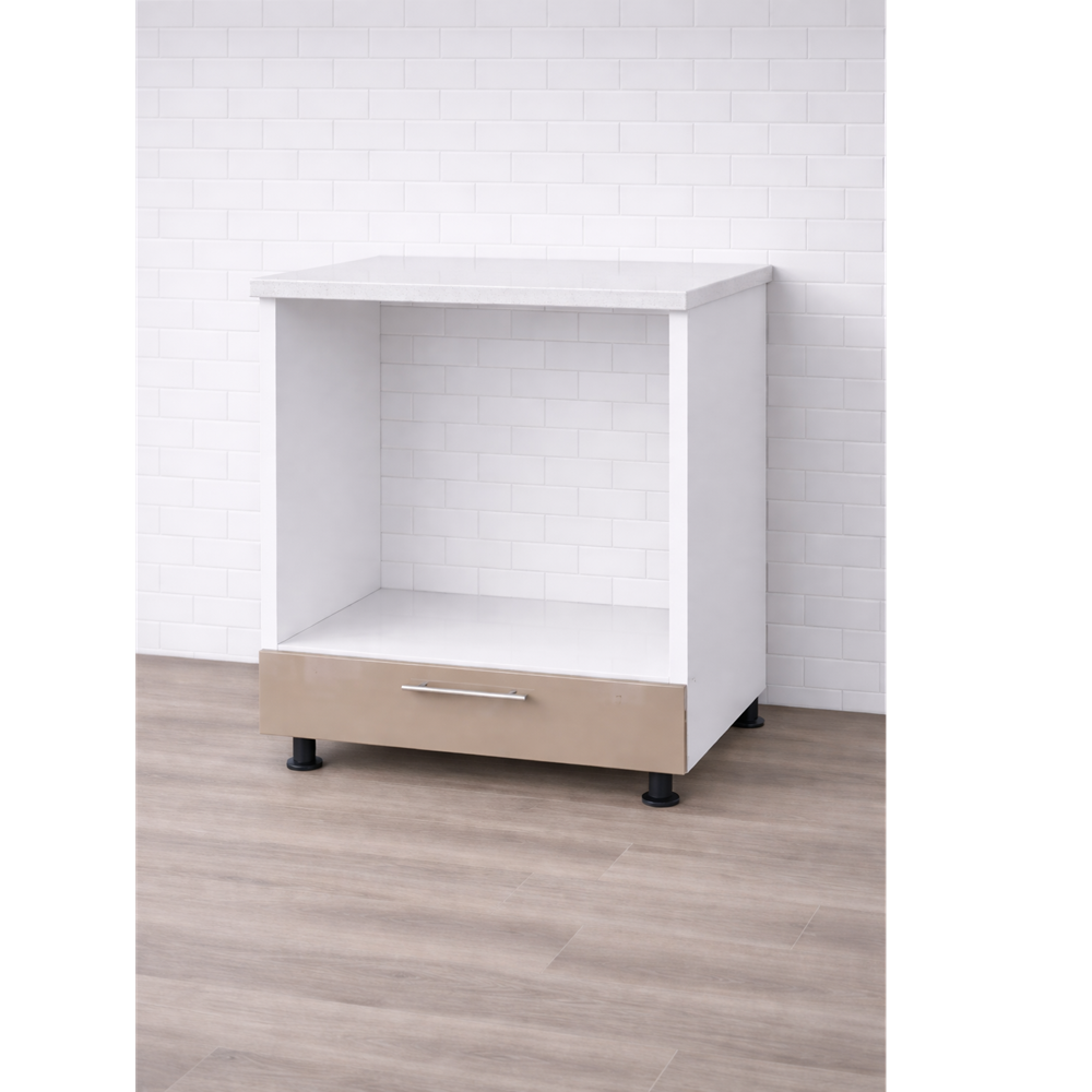 Corpul de cuptor și plită este construit pe o carcasă solidă din PAL melaminat alb, cu fronturi în din MDF lucios cappuccino. Este echipat cu un blat de lucru cu pelicula termorezistenta de 28 mm, esențial pentru activitățile zilnice din bucătărie. În partea inferioară, corpul include un compartiment cu ușă, perfect pentru depozitarea accesoriilor necesare frecvent.