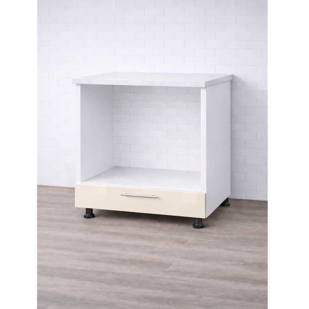 Corpul de cuptor și plită este construit pe o carcasă solidă din PAL melaminat alb, cu fronturi în din MDF lucios crem. Este echipat cu un blat de lucru cu pelicula termorezistenta de 28 mm, esențial pentru activitățile zilnice din bucătărie. În partea inferioară, corpul include un compartiment cu ușă, perfect pentru depozitarea accesoriilor necesare frecvent.