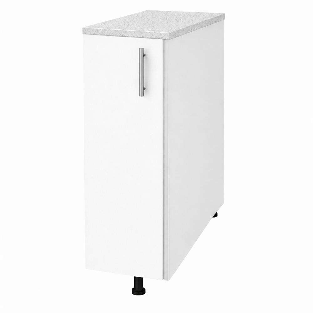 Acest corp bucatarie inferior 15 cm cu blat, alb este soluția perfectă pentru zonele înguste ale bucătăriei, unde ai nevoie de un spațiu suplimentar de depozitare fără a compromite designul. Realizat din PAL melaminat de înaltă calitate, în nuanța elegantă alb, aduce un plus de stil și funcționalitate oricărei bucătării moderne.