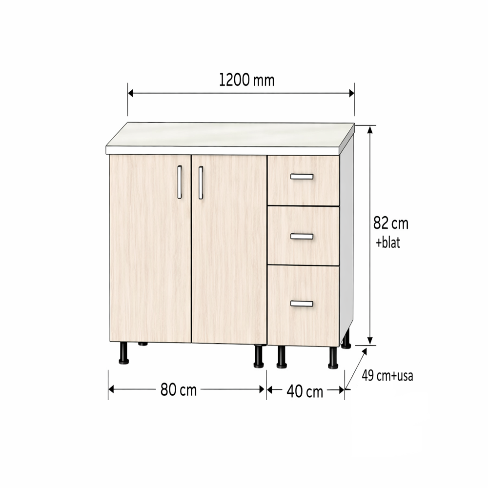 • Corp bază 40 cm cu 3 sertare: 40 x 51 x 85 cm
