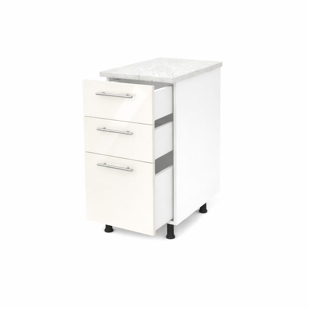 Optimizeaza-ti spatiul de depozitare in bucatarie cu acest corp inferior bucatarie 40cm cu sertare MDF lucios bianco, cu blat. Un element esential pentru orice bucatarie moderna. Cu un design compact si eficient. Acest dulap ofera solutii practice. Util pentru organizarea tacamurilor, paharelor, farfuriilor si alimentelor, totul la indemana.