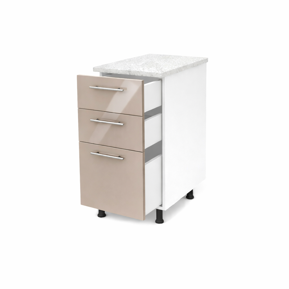 Optimizeaza-ti spatiul de depozitare in bucatarie cu acest corp inferior bucatarie 40cm cu sertare MDF lucios cappuccino, cu blat. Un element esential pentru orice bucatarie moderna. Cu un design compact si eficient. Acest dulap ofera solutii practice. Util pentru organizarea tacamurilor, paharelor, farfuriilor si alimentelor, totul la indemana.