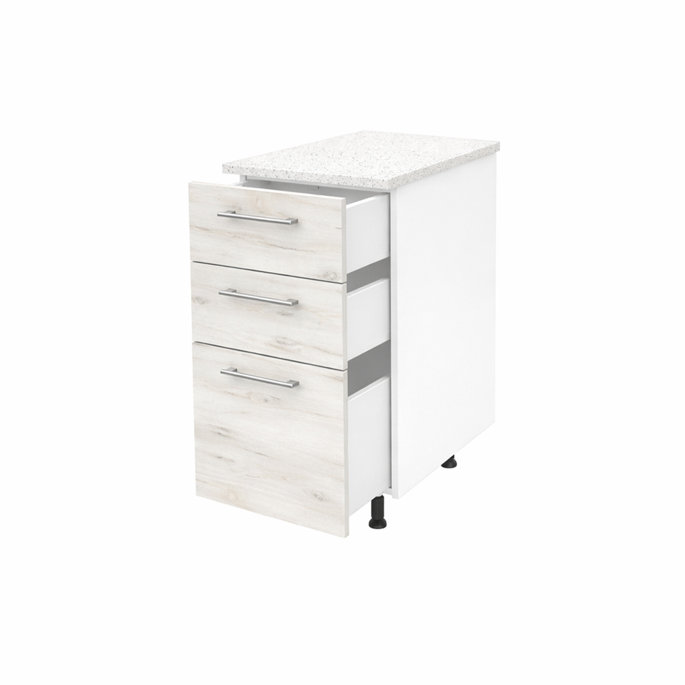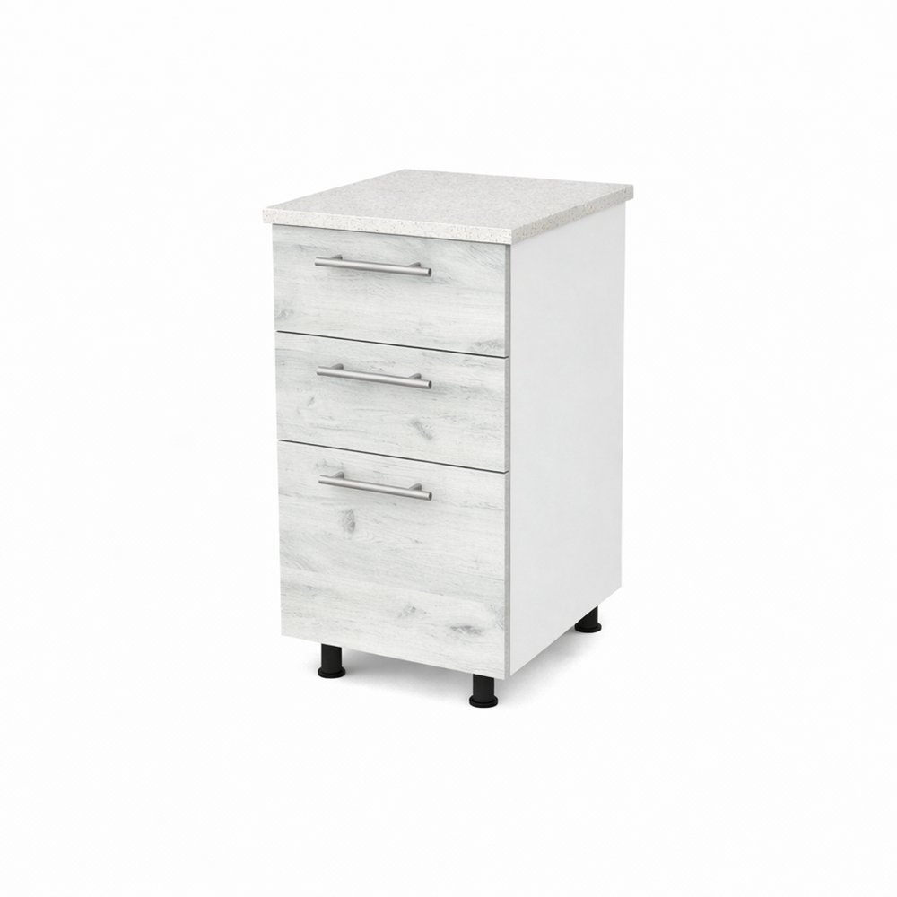 - Design functional si elegant 🗄️: Corp inferior bucatarie 40cm cu sertare PAL stejar alb, cu blat este perfect pentru organizarea eficienta a spatiului din bucatarie. Sertarele spatioase si glisierele cu bile asigura o deschidere si inchidere usoara, oferind acces rapid la toate articolele depozitate.