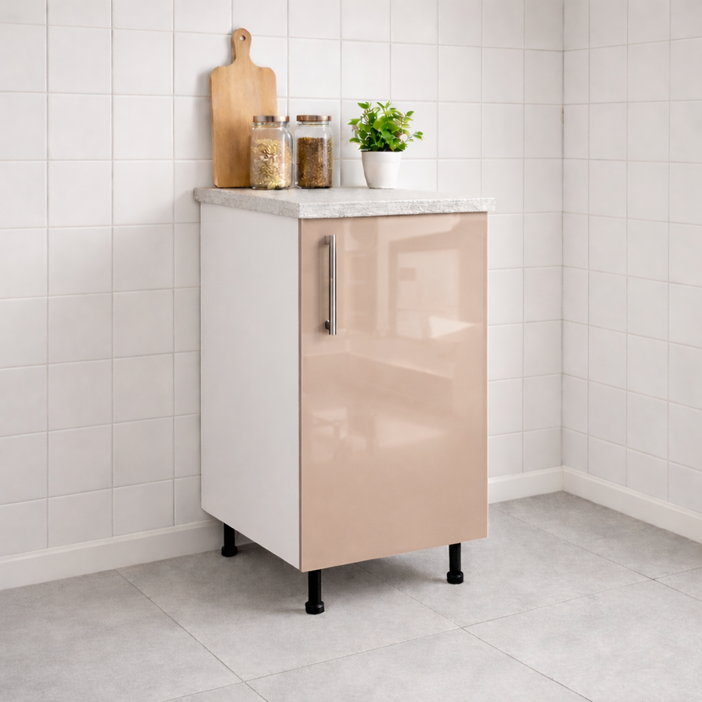 Optimizeaza-ti spatiul de depozitare cu acest Corp Inferior Bucatarie cu blat 40cm MDF lucios cappuccino. Este perfect pentru orice bucatarie moderna. Fabricat din PAL melaminat si mdf lucios de inalta calitate. Acest dulap ofera un design modern si functionalitate maxima. Este ideal pentru organizarea eficienta a ustensilelor si produselor de bucatarie. Corpul inferior este prevazut cu o usa care ascunde o polita interioara. Oferind spatiu generos pentru depozitare. Blatul termorezistent de 28 mm asigura o suprafata de lucru durabila.