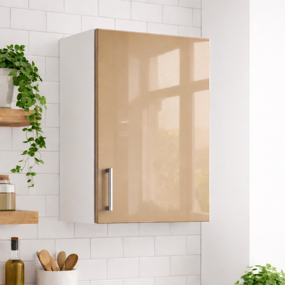 Modul superior bucătărie 30 cm finisaj MDF lucios cappuccino– îl poți combina cu alte corpuri superioare pentru a crea o bucătărie perfect adaptată nevoilor tale. Mânerele metalice moderne completează designul și adaugă un plus de rafinament.
