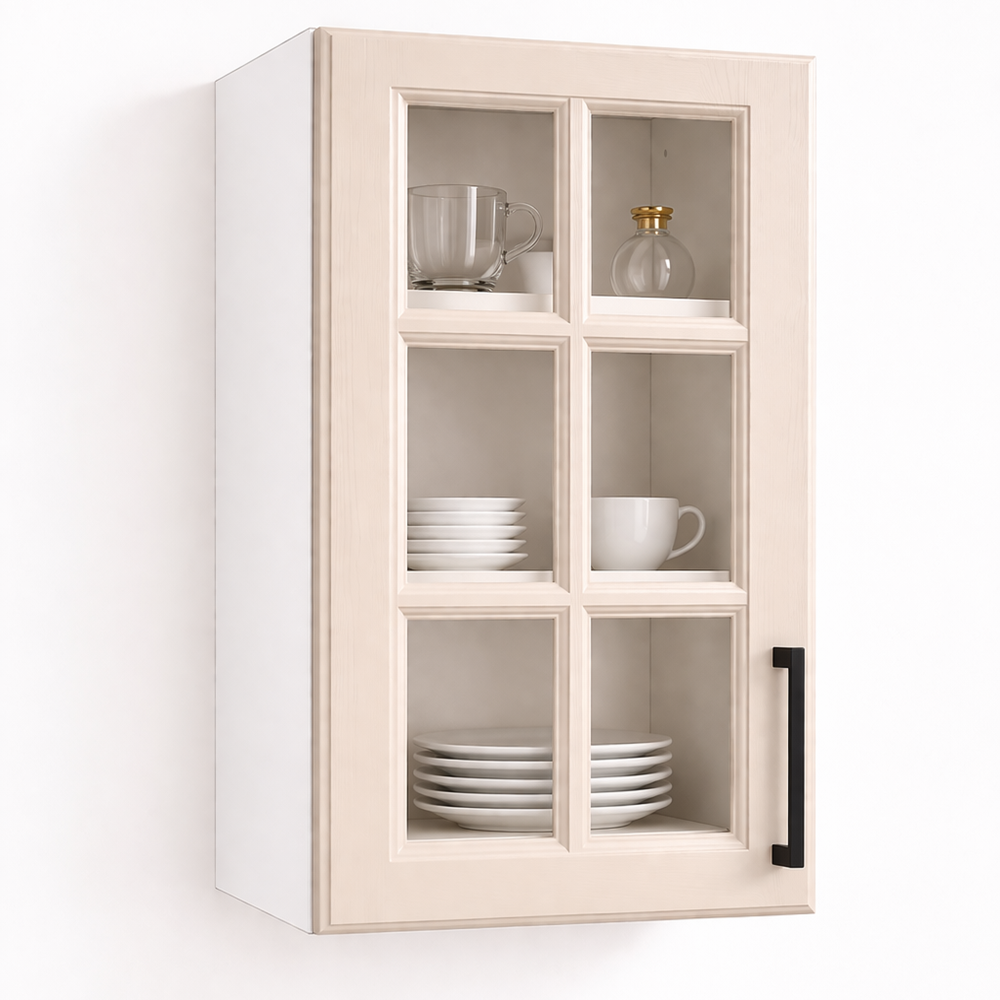 Modul superior bucătărie 40 cm finisaj MDF infoliat casmir vitrina– îl poți combina cu alte corpuri superioare pentru a crea o bucătărie perfect adaptată nevoilor tale. Mânerele metalice moderne completează designul și adaugă un plus de rafinament.