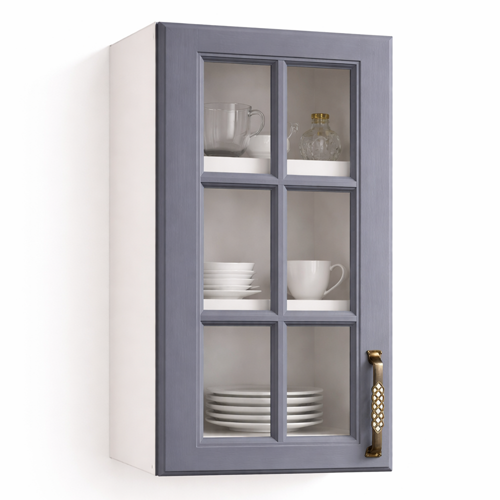 Modul superior bucătărie 40 cm finisaj MDF infoliat gri vitrina– îl poți combina cu alte corpuri superioare pentru a crea o bucătărie perfect adaptată nevoilor tale. Mânerele metalice moderne completează designul și adaugă un plus de rafinament.