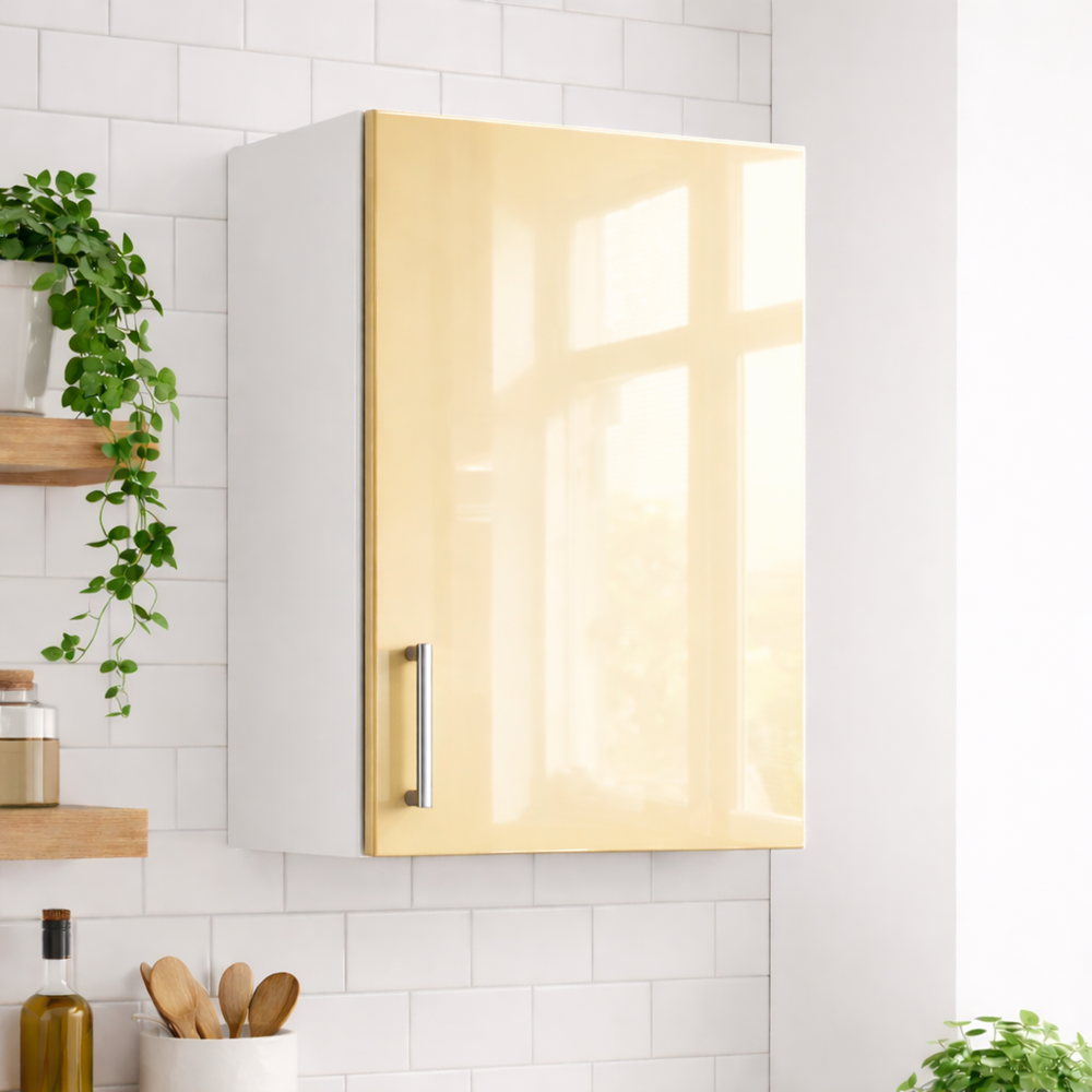 Modul superior bucătărie 40 cm finisaj MDF lucios crem– îl poți combina cu alte corpuri superioare pentru a crea o bucătărie perfect adaptată nevoilor tale. Mânerele metalice moderne completează designul și adaugă un plus de rafinament.