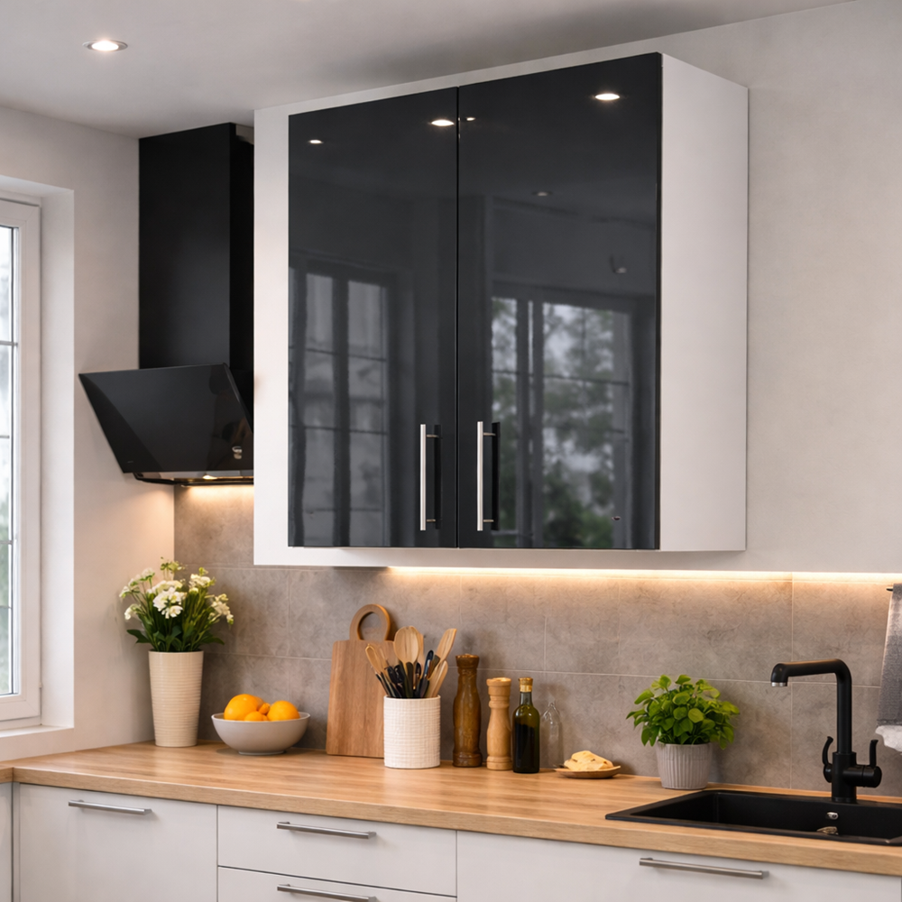 Corp suspendat bucatarie 60cm MDF lucios antracit este o piesă practică. Este elegantă pentru orice bucătărie modernă. Realizat din materiale de calitate. Acesta are carcasa (cutia) și polița interioară din PAL alb, în timp ce fronturile sunt realizate din MDF lucios antracit. Aduce un contrast plăcut și un aspect contemporan.
