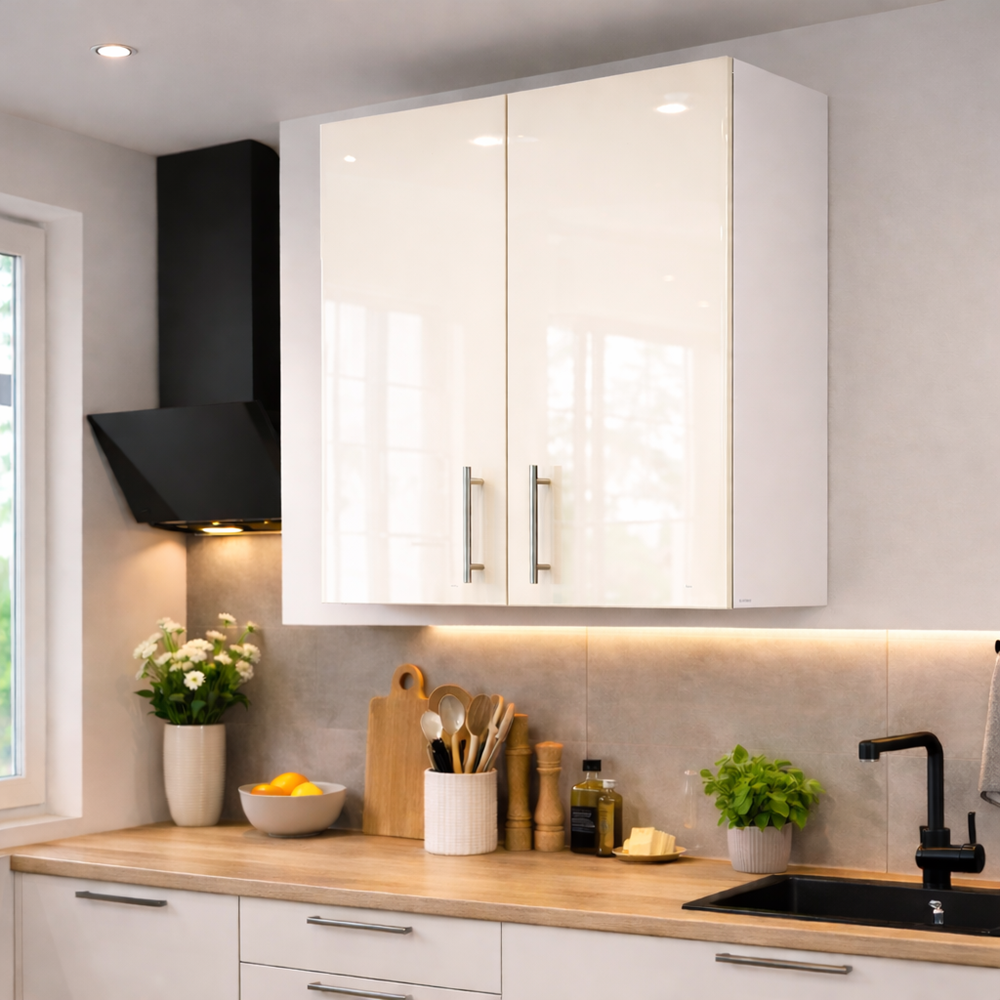 Corp suspendat bucatarie 60cm MDF lucios bianco este potrivit pentru depozitarea obiectelor uzuale din bucătărie: pahare, farfurii, recipiente, condimente sau accesorii. Este ideal atât pentru spații compacte, cât și pentru bucătării generoase, fiind un element modular ce se poate integra cu ușurință în ansambluri de mobilier existente.