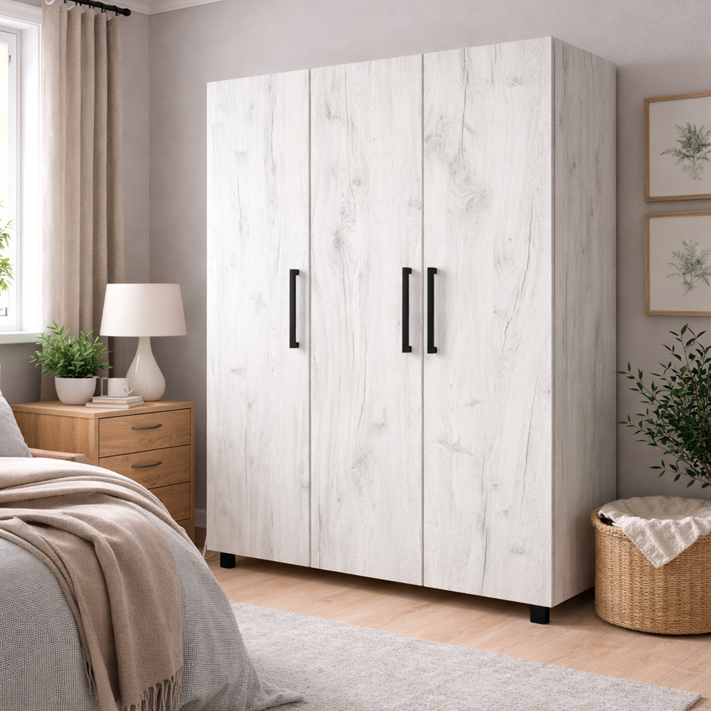 Dulap 3 uși 120x50x200 cm PAL stejar alb este o soluție practică și eficientă pentru organizarea hainelor și accesoriilor în dormitor sau hol. Datorită compartimentării bine gândite și designului modern, acest sifonier oferă spațiu generos de depozitare și un aspect elegant, potrivit pentru orice locuință.