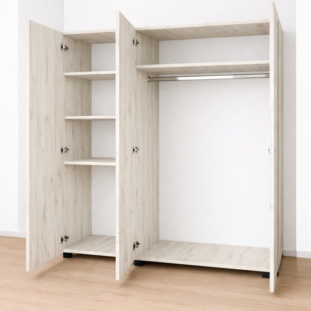 Dulapul este prevăzut cu 3 uși, polite spațioase și bară pentru haine, oferind suficient spațiu pentru haine pe umeraș, lenjerie și accesorii.