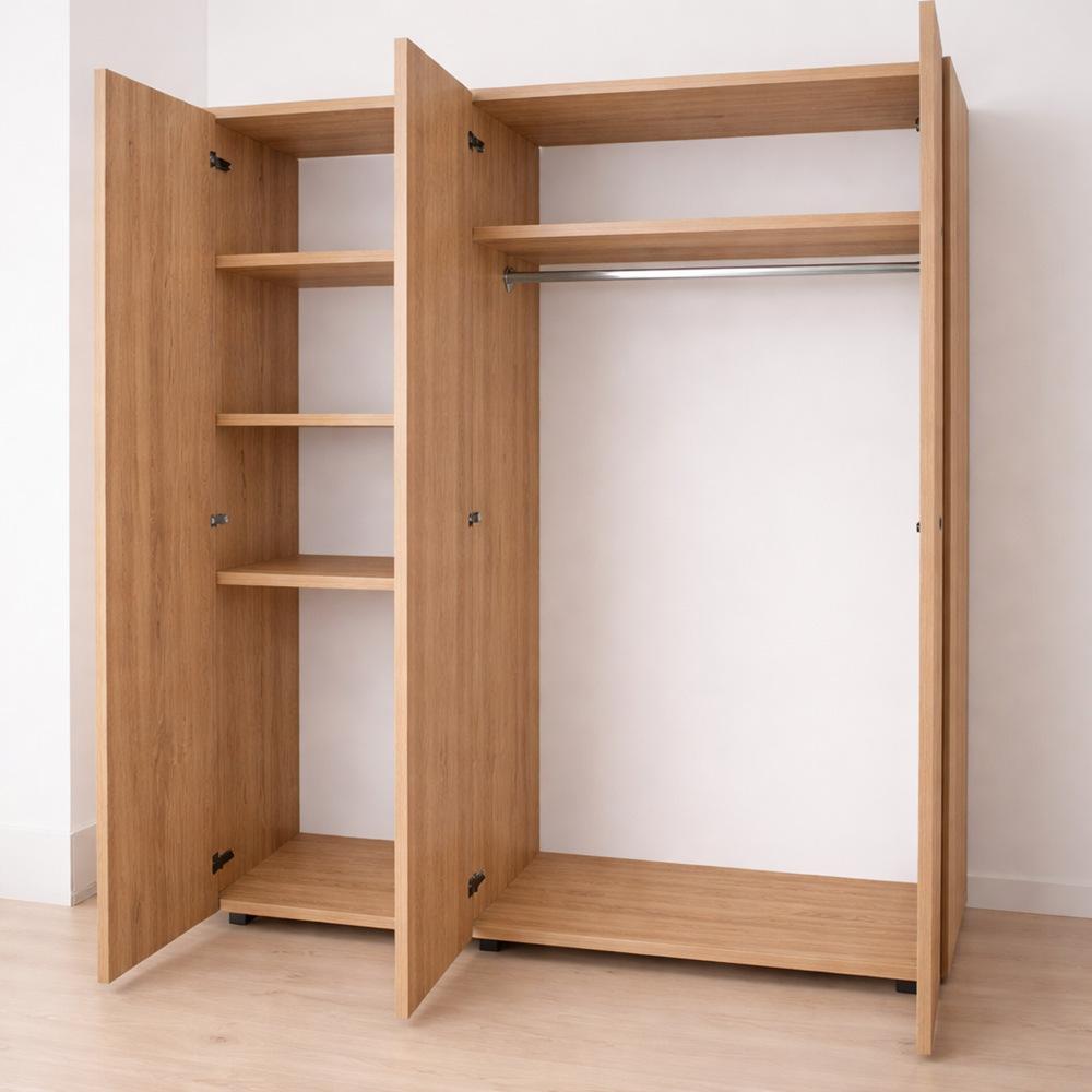 Dulapul este prevăzut cu 3 uși, polite spațioase și bară pentru haine, oferind suficient spațiu pentru haine pe umeraș, lenjerie și accesorii.