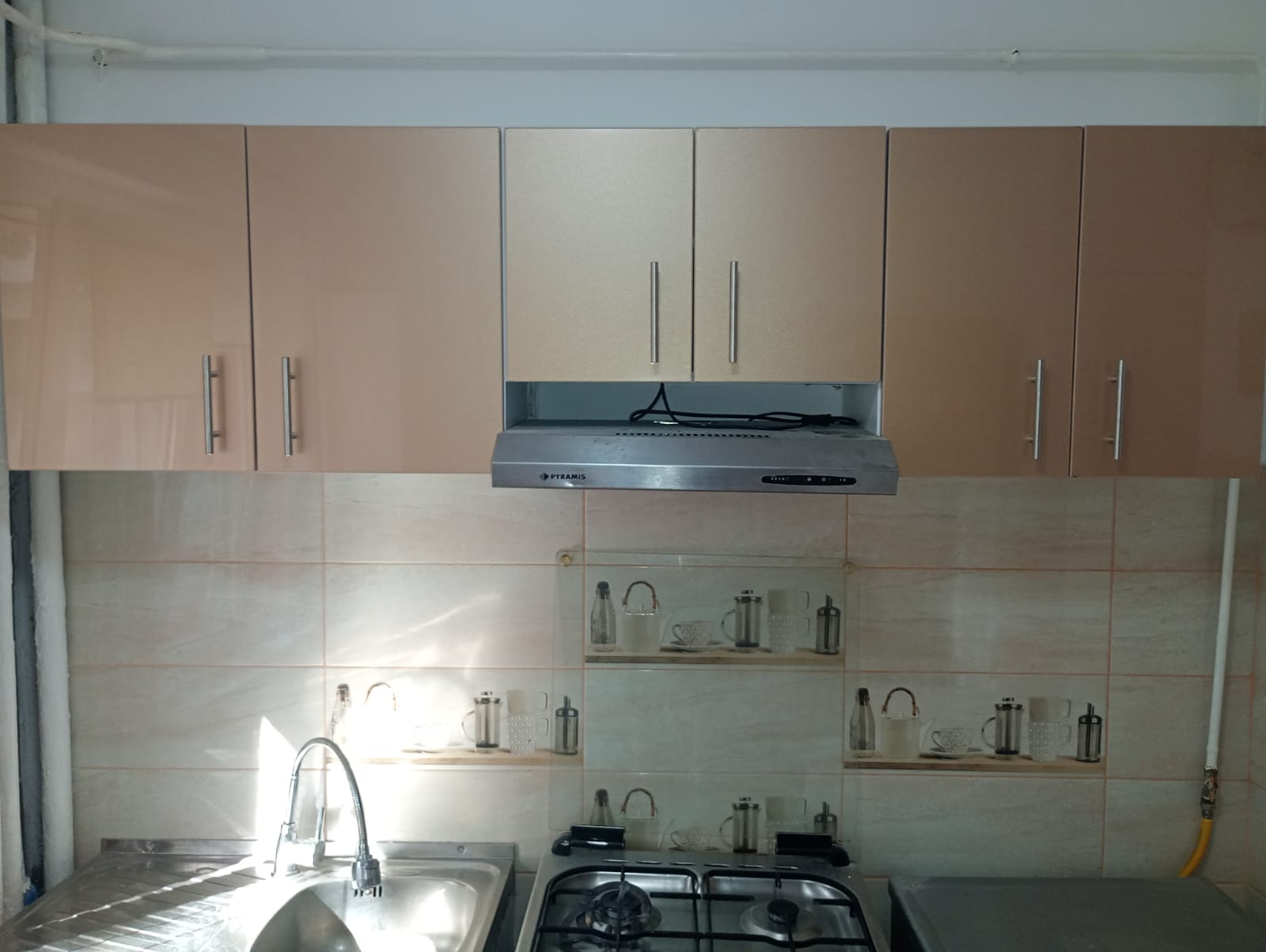 Set compact de mobilă Bucătărie MDF capucino lucios EVO P103 140 cm cu fronturi din MDF Capucino Lucios EVO P103 și blat termorezistent Alb Mersin, conceput pentru spații moderne și elegante.