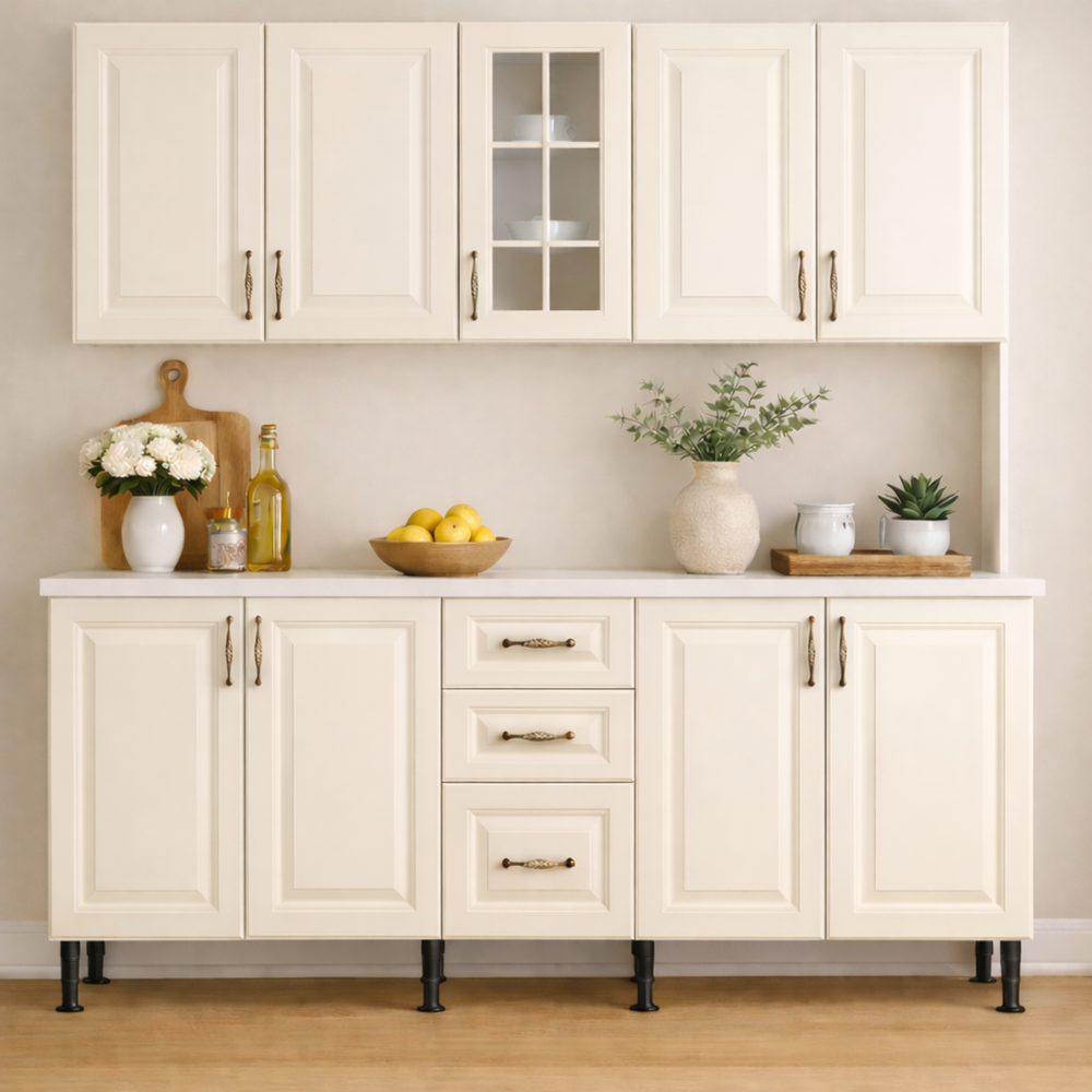 Set complet de mobilă bucatarie MDF infoliat ivoire 180 cm cu vitrina ideal pentru spații moderne și elegante, cu fronturi din MDF infoliat ivoire structuratși blat termorezistent Alb Mersin. Compartimentare practică, picioare reglabile din PVC și mânere metalice Imaj 21000. Ușor de montat și întreținut.