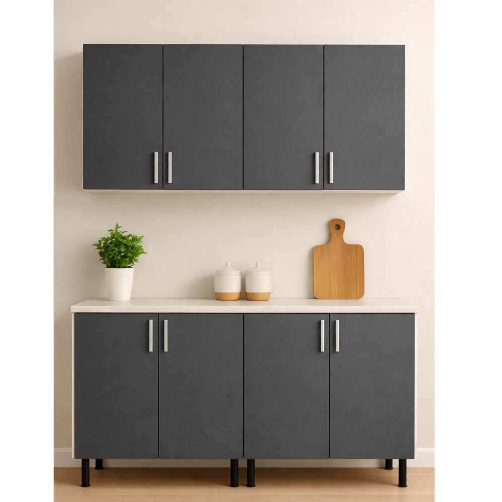 Acest set deMobila bucatarie pal antracit 160 cm cu blat , realizat din PAL melaminat antracit, aduce un plus de rafinament și stil în orice spațiu modern. Blatul termorezistent oferă un contrast luminos și curat, iar setul este compact, estetic și practic, proiectat pentru organizare eficientă și rezistență în timp.