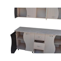 Setul de bucătărie modulară, cu o lungime de 220 cm, este ideal pentru apartamente sau spații compacte, oferind funcționalitate și organizare excelentă. Partea superioară este perfectă pentru depozitarea cănilor, paharelor și condimentelor, iar partea inferioară este destinată tacâmurilor, oalelor și include spațiu pentru chiuvetă.