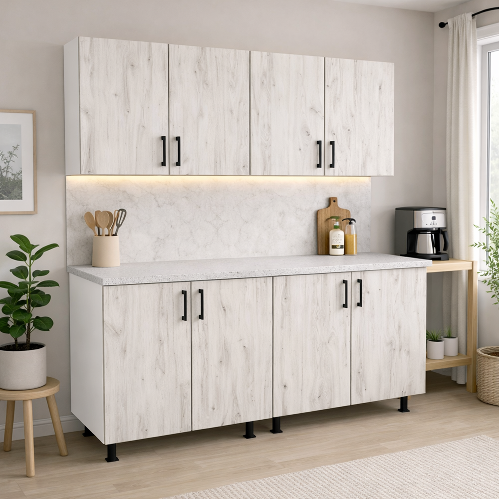 Setul este livrat în colete, cu toate elementele necesare pentru montaj. Chiuveta, electrocasnicele și obiectele decorative NU sunt incluse — acestea sunt prezentate doar în scop ilustrativ.