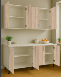 Acest set de bucătărie de 150 cm, realizat din PAL melaminat Stejar Sonoma, aduce un plus de căldură și naturalețe în orice spațiu modern. Blatul Alb Mersin oferă un contrast luminos și curat, iar setul este compact, estetic și practic, proiectat pentru organizare superioară și durabilitate.
