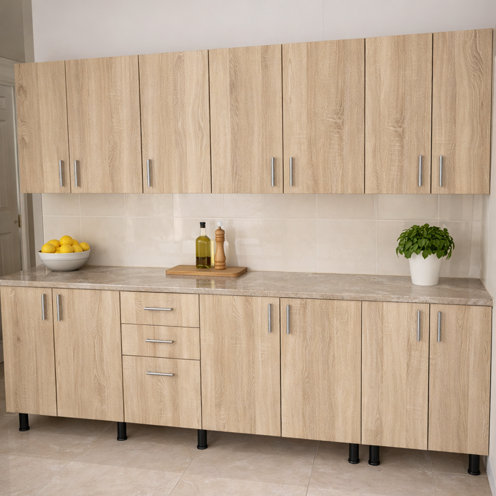 Mobila de bucatarie 280 cm sonoma soluția perfectă pentru o bucătărie modernă. Este bine organizată și luminoasă. Acest set de mobilă modulară este realizat din PAL melaminat. Se potrivește ideal în apartamente sau case. Ofera un echilibru între design elegant și funcționalitate practică.