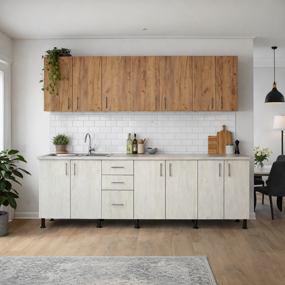Mobila de bucatarie 280 cm, stejar alb k001 si stejar auriu k003 soluția perfectă pentru o bucătărie modernă. Este bine organizată și luminoasă. Acest set de mobilă modulară este realizat din PAL melaminat. Se potrivește ideal în apartamente sau case. Ofera un echilibru între design elegant și funcționalitate practică.