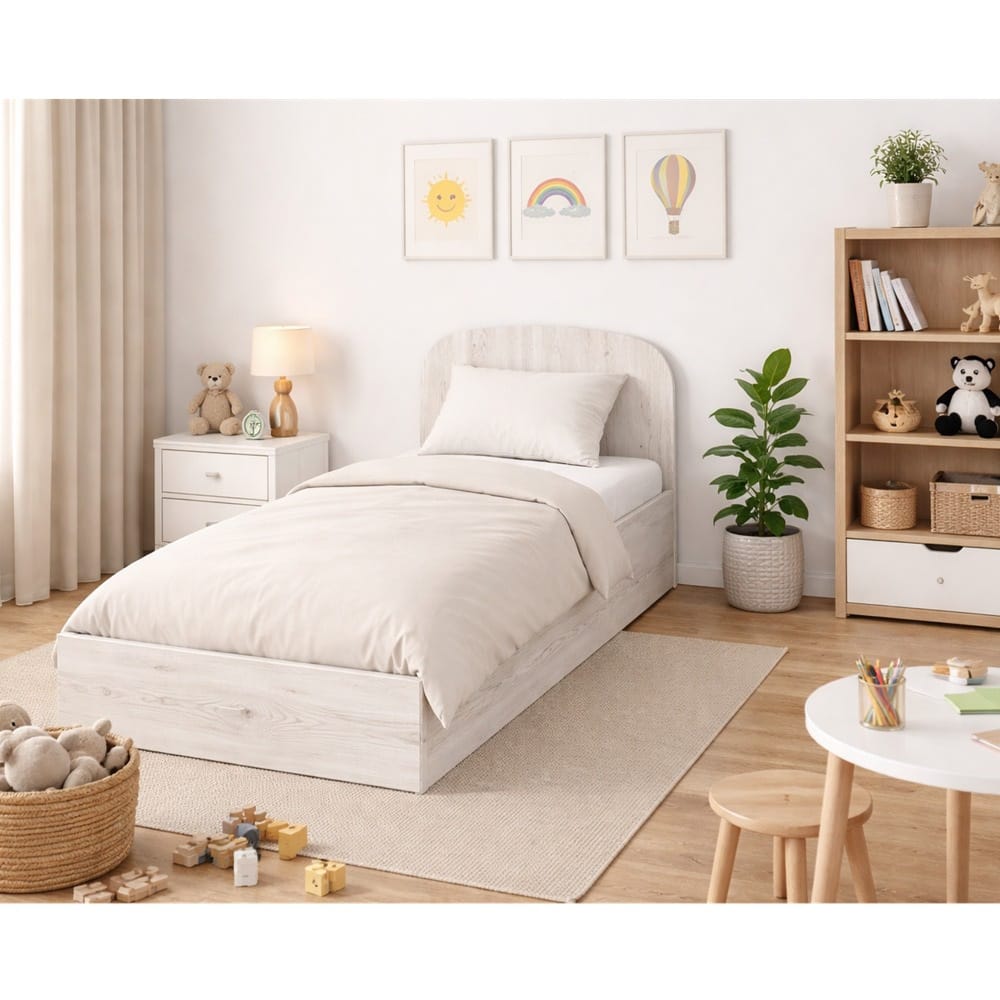 Pat din PAL stejar alb pentru saltea 90 x 200 cm rezistent , ideal pentru dormitoare moderne,somieră din PALși picioare din plastic care protejează pardoseala.