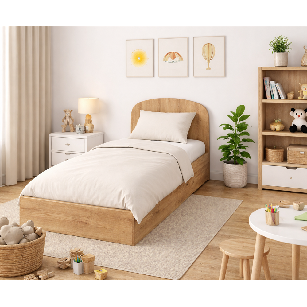 Pat din PAL stejar auriu pentru saltea 90 x 200 cm rezistent , ideal pentru dormitoare moderne,somieră din PALși picioare din plastic care protejează pardoseala.