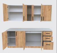 Bucătăria Lana 220 cm Stejar Auriu K003 este ideală pentru a păstra totul organizat. Sertarele și dulapurile oferă spațiu suficient, iar masca pentru chiuvetă adaugă un plus de utilitate și ordine.