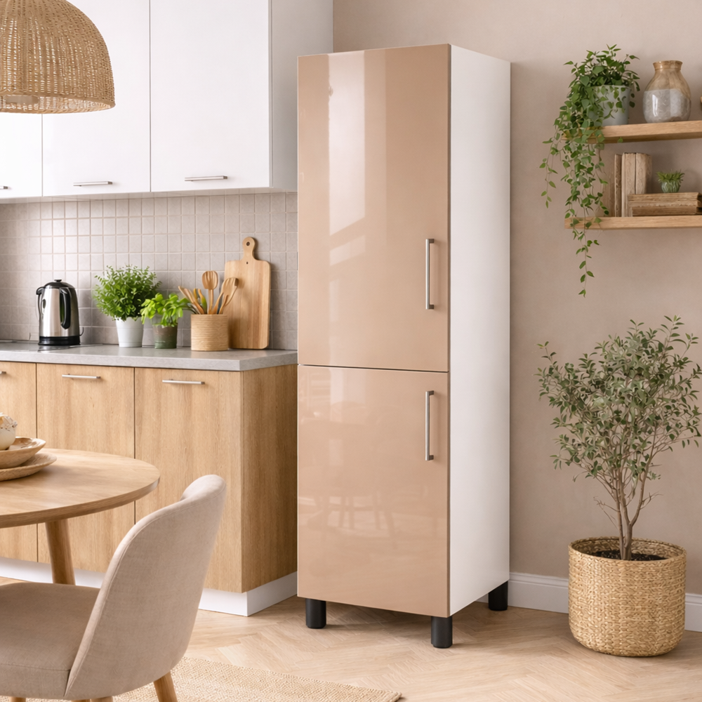 Acest Soldat de bucatarie 2 usi 60x60x215cm MDF cappuccino ste modular. Corpul este compartimentat in partea superioara si inferioara cu polite orizontale mascate de usi.. In costul acestui produs sunt incluse urmatoarele componente: carcasa/corpul, fronturi, manere, polite, feronerie.