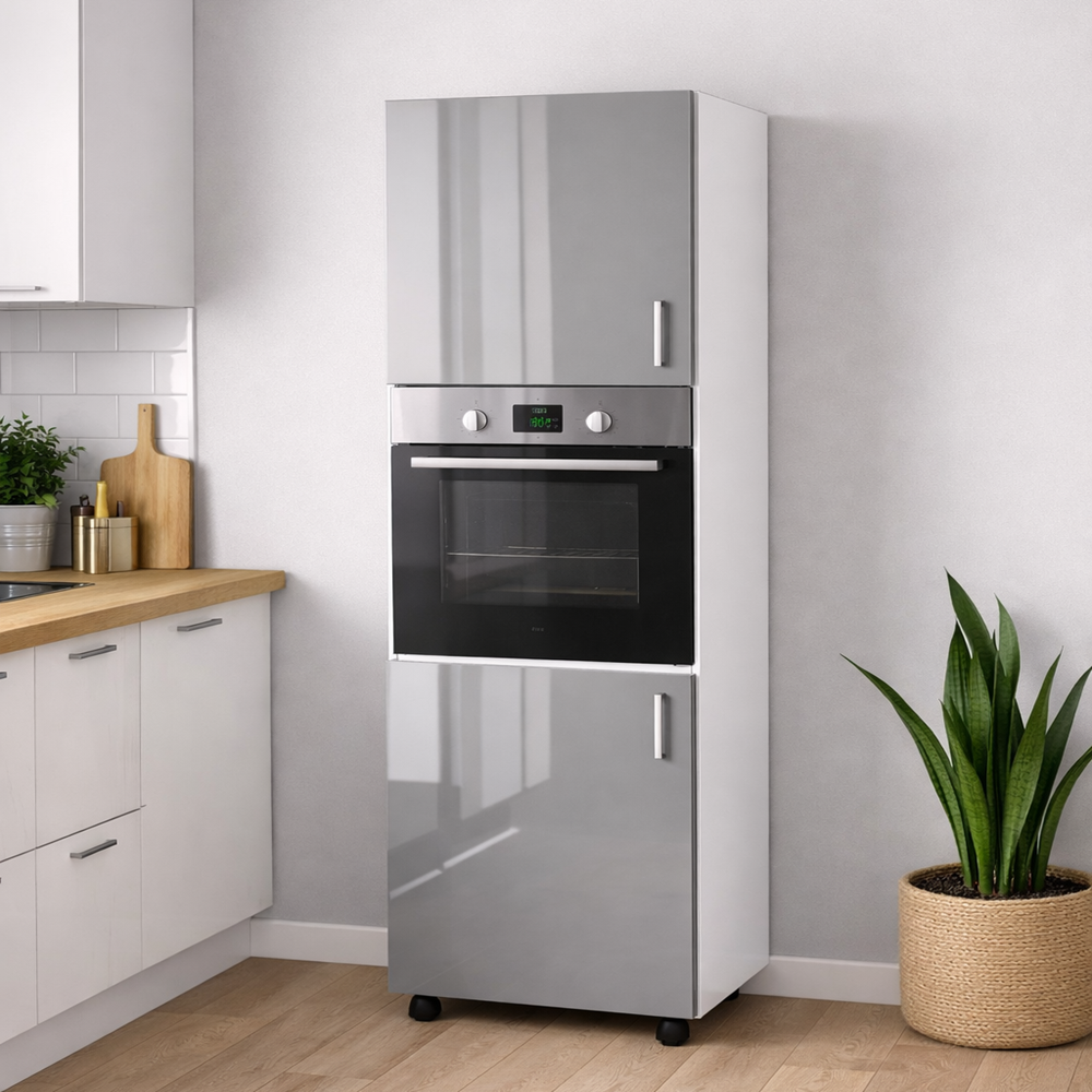 Acest Soldat de bucatarie pentru cuptor incorporabil MDF lucios gri este modular. Corpul este compartimentat in partea superioara si inferioara cu 2 polite orizontale mascate de usa. In partea centrala are un spatiu standard dedicat pentru cuptorul incorporabil. Se potriveste cu majoritatea cuptoarelor incorporabile standard. In costul acestui produs sunt incluse urmatoarele componente: carcasa/corpul, fronturi, manere, polite, feronerie. Cuptorul nu este inclus.